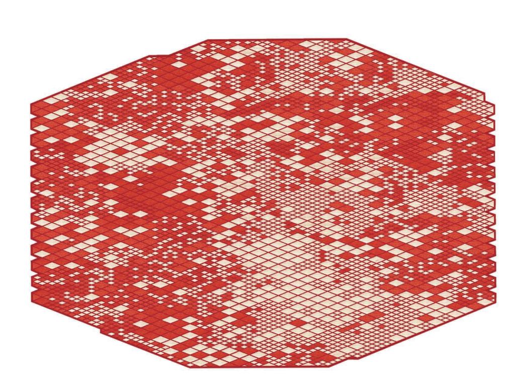 The Spanish carpet maker collaborated with French designers Erwan and Ronan Bouroullec on Losanges, a trio of area rugs. The latest addition to the series, Losanges III, repeats a rhombus shape to form a geometric lattice in red and white colorways. The rug is hand-woven from hand-spun wool by craftsmen in northern Pakistan using a process emulating that of traditional kilims and resulting in slight variations in color and arrangement with each iteration.