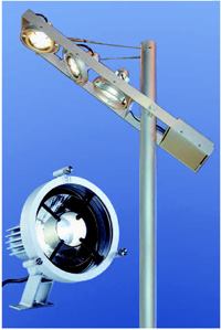 Pro Series precision floodlights are constructed of die-cast, high-purity aluminum and are available in three sizes with lamping choices that range from 13W compact fluorescents to 1000W HID sources. A wide variety of mounting options, beam patterns, lenses, filters, and louvers are offered, as well as the company’s Cardanic Systems gimbal mounting frames (shown) for suspended and pole-mount applications.