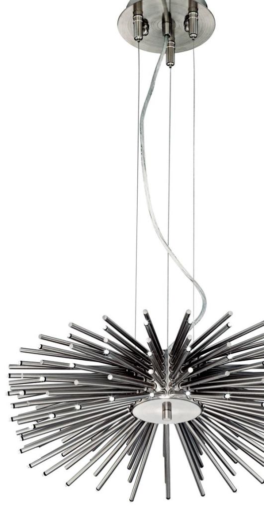 The Possini chandelier features 75 individual rods arranged around a center short column. At the end of each rod is a 1W LED. The luminaire is finished in a brushed nickel and the rod cluster measures 18 inches wide by 5 inches tall. The overall hanging length of the fixture is 10 feet, and the canopy mounting plate is 6 1/4 inches in diameter. lampsplus.com