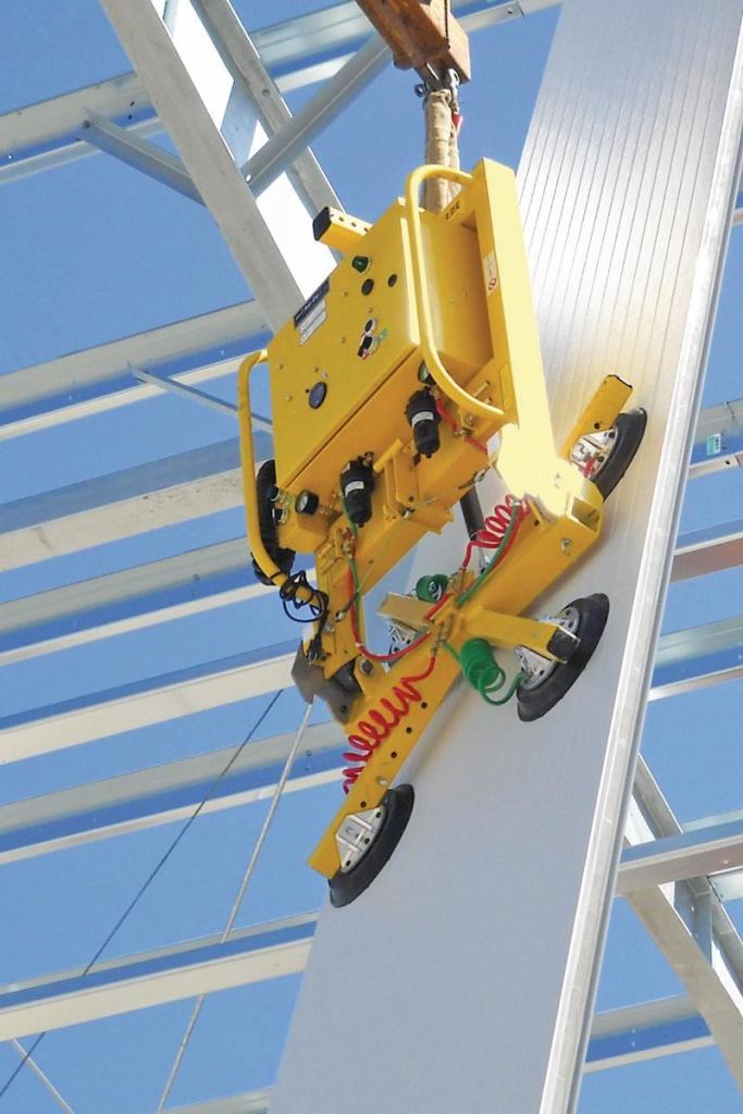 The Cladding Lifter 700 Series from Wood’s Powr-Grip is a vacuum lifter that accommodates wall and roof panels up to 50 feet long and loads up to 700 pounds using standard pad frame extensions. The dual vacuum system maintains the vacuum level in one circuit even if a vacuum loss occurs in the other. Vacuum pads attach directly to the face of the panel, keeping edges free for exact panel placement, while quick attachment and release increase productivity. Standard features include an on-board power system, battery charger and movable control pendant.
