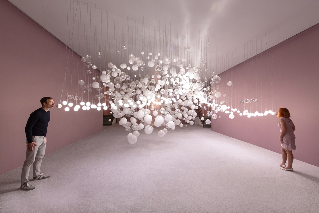 Specialists in Bohemian glass products, Prague-based Preciosa Lighting is injecting a dose of whimsy into the 2018 Salone del Mobile in Milan (through April 22) with its latest design concept, “Breathing New Life into Light.” Resembling a cloud of bubbles, the installation features hundreds of opaque and translucent orbs that emit or reflect light.