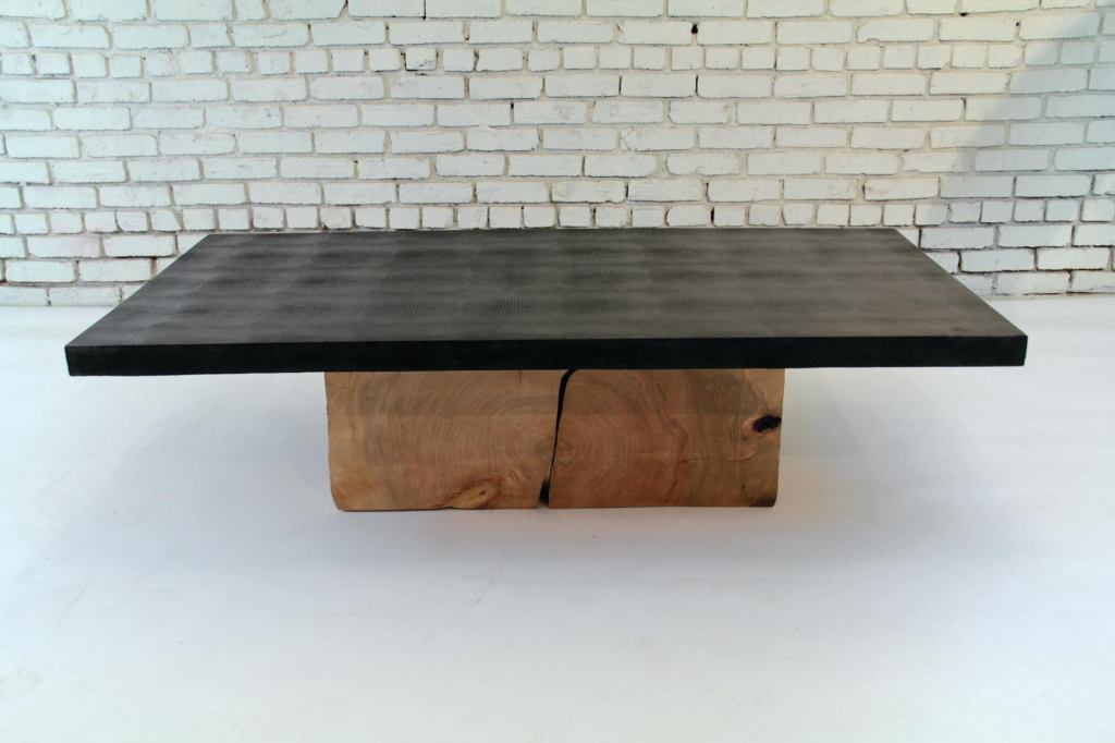 Strata, the latest collection of tables and benches by Brooklyn, N.Y.–based André Joyau, combines reclaimed hardwood or industrial-steel bases with high-strength cementitious surfaces. Available in natural gray, driftwood, off-white, or black, the surfaces are imprinted with nature-inspired patterns, including lotus leaf, snakeskin (shown), and ostrich skin. Tabletops are round, rectangular, or square; benches are 15″ wide and 36″ to 120″ long. Custom sizes are available. • andrejoyau.com