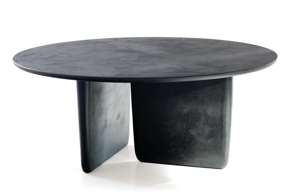 Designed by Edward Barber and Jay Osgerby for B&B Italia, Tobi-Ishi embodies the beauty and simplicity of the ornamental stones found in traditional Japanese gardens, for which the table is named. With a cantilevered, 63″-diameter wooden top and a base that varies in look depending on your viewing angle, the structural, polyurethane-foam table has a cement-grout finish coat, giving the piece a smooth, but textural, appearance. • bebitalia.com