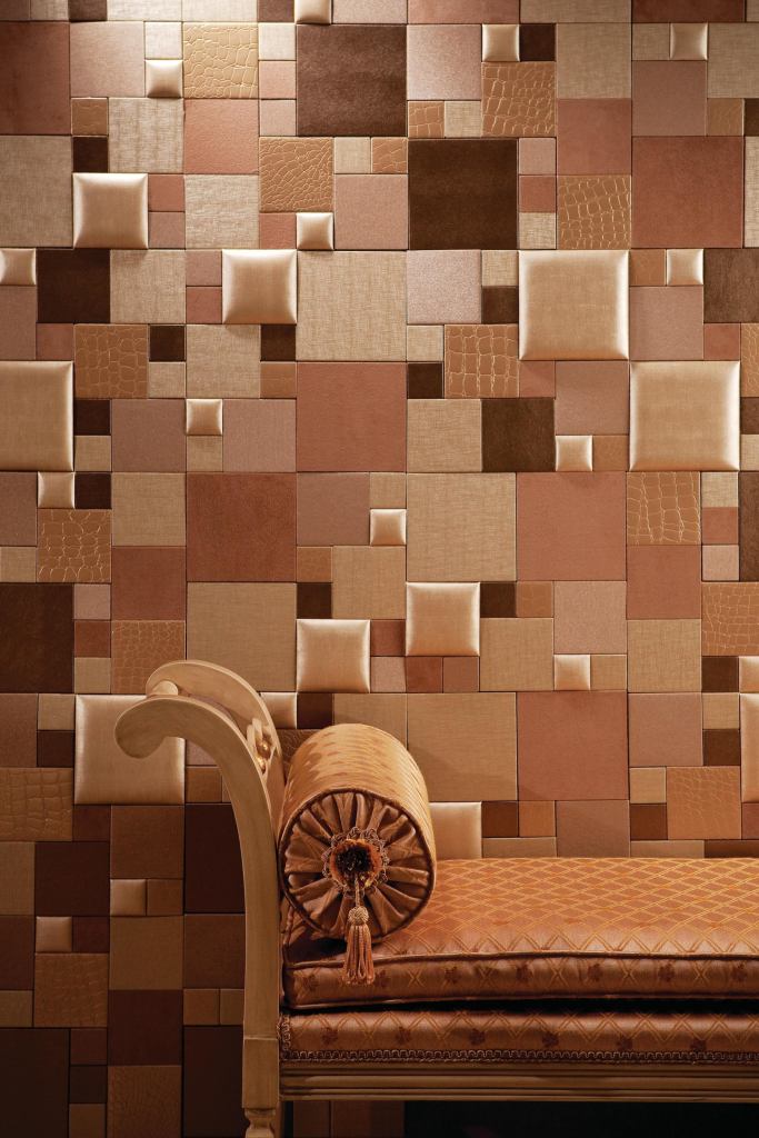 Concertex’s NappaTile uses commercial-grade upholstery to create two- and three-dimensional tiles that emulate the look of leather. Available with a regular, padded, stitched, or buttoned finish, the tiles may be arranged in 24 standard mosaic patterns in 250-plus colorways. More than 1,000 faux-leather, faux-suede, and textile materials are available. The peel-and-stick tiles are backed with mineral board. Large-format and stain-resistant tiles are also offered. • concertex.com