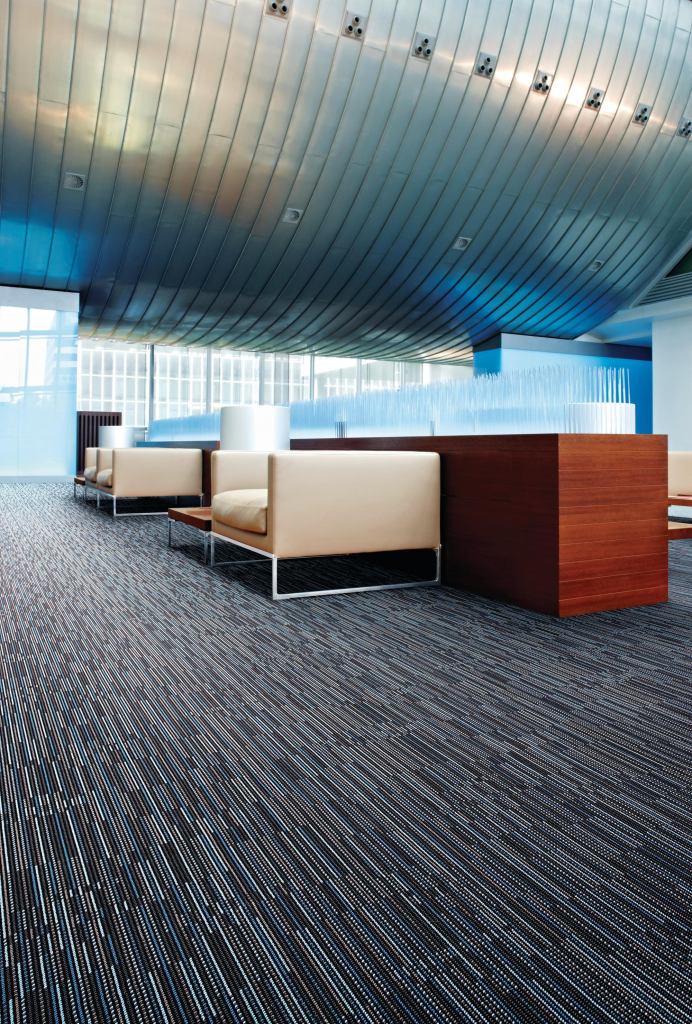 Desso’s Patterns@Play collection features six modular and one broadloom carpets. Designed with large spaces in mind, the patterns can help visually subdivide rooms and define traffic paths. Offered in four to 16 colorways depending on the pattern, the 50cm square carpet tiles come in patterns such as Visions of Shards, Grids, and Dash. The 400cm-wide broadloom carpet Wilton Enigma (shown) has a woven loop-pile construction and comes in eight colors. • desso.com
