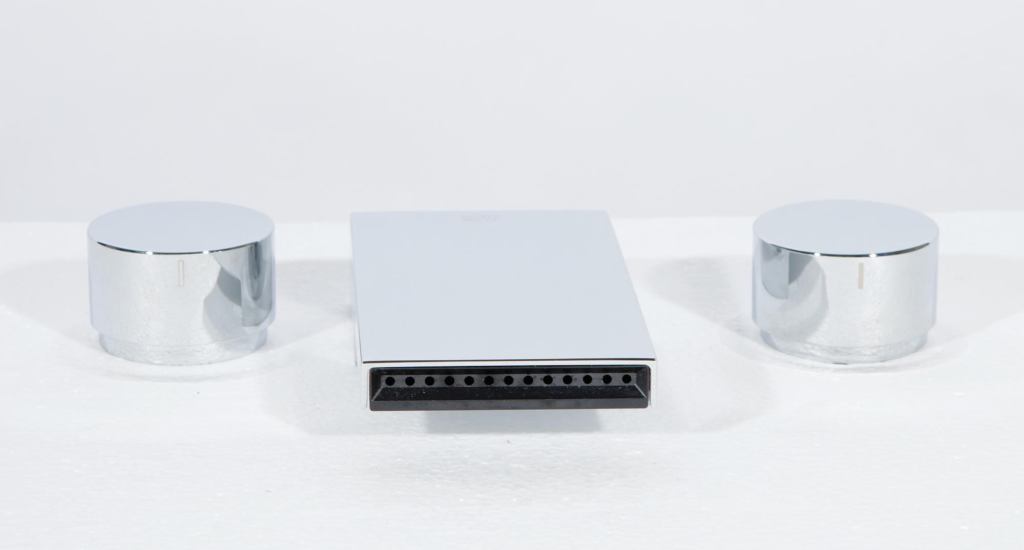 Deque by Dornbracht has a geometric, cantilevered spout that delivers a waterfall-style flow. The wide, low-profile spout projects 110mm and has a maximum flow rate of 4L per minute (1.06 gpm). The spout and cylindrical control knobs stand 30mm tall. Available in polished chrome (shown) or matte black, Deque can be wall- or deck-mounted; a single-lever mixer configuration is also offered. • dornbracht.com
