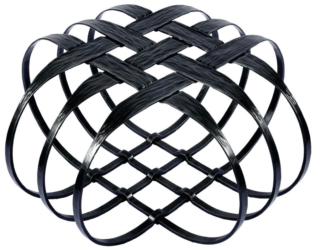 Megaweave is an outdoor seating piece by Dunja Weber, a design studio based in Milan, Italy. Based on the concept of weaving threads to form a fabric, Megaweave consists of six intertwined horizontal and vertical iron rings that form its sculptural shape. To create the seating surface, Weber hand-hammered the forged, 2cm-square iron bars into 7cm-wide ribbons. The sturdy black piece is 40cm high with a 75cm diameter. • dunjaweber.com