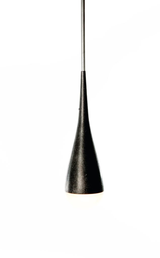 Eleek’s Liquid, an energy-efficient drop fixture, may be used independently or in groups of three to five to create a multipendant chandelier. Handmade in Portland, Ore., with a handblown, etched-glass diffuser and 100%-recycled cast-aluminum or 90%-recycled cast-bronze body, the fixture is available in several finishes, including natural aluminum with the River Rock finish (shown). Liquid is 8-3/4″ tall with a 2-1/2″ diameter, and uses a 3W LED. • eleekinc.com