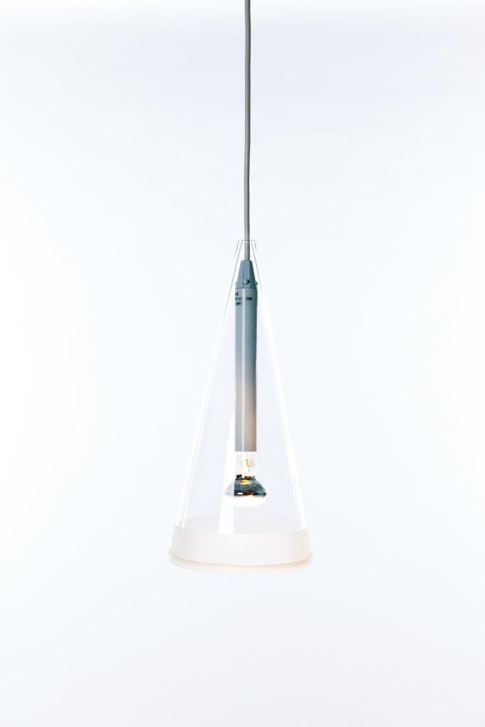 Flos’s Fucsia 1, designed by Achille Castiglioni in 1996, features a conical blown-glass diffuser that provides direct and diffused light. The glass fixture has a 1.5″-sandblasted bottom edge and a translucent silicone ring. It operates with a 40W R50 E14 reflector incandescent bulb. The 5-lb. fixture is 13.6″ tall with a 6.3″-diameter base; a 192″-long cable connects the fixture to a white ceiling canopy. • flosusa.com