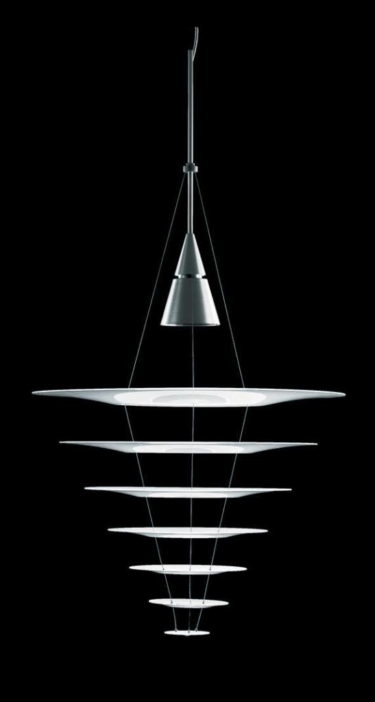 Louis Poulsen’s Enigma 825 uses thin aluminum wires to hold its concentric acrylic shades level. The shades obscure the light source—which can be a ceramic metal halide or tubular halogen lamp—from any angle and emits an evenly distributed downlight. Weighing 16 lbs., Enigma 825 is 61″ tall with a maximum diameter of 32.5″ and hangs 118.1″. Smaller versions of the fixture are available in the Enigma series. • louispoulsen.com