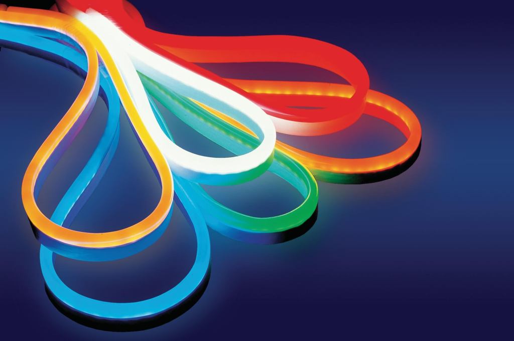 Suitable for indoor and outdoor applications, Border Flex by Osram Sylvania is a flexible strip of LEDs encased in a waterproof PVC jacket. Using less than 10% of the energy consumed by neon, it consumes 1.2W or 1.6W per foot and produces uniform light that is diffused to 180 degrees. Available in 30′ and 150′ rolls, Border Flex has a maximum loading length of 120′ for white, blue, and green colors, and 160′ for red, orange, and yellow colors. It may be bent by hand and cut for custom lengths. sylvania.com