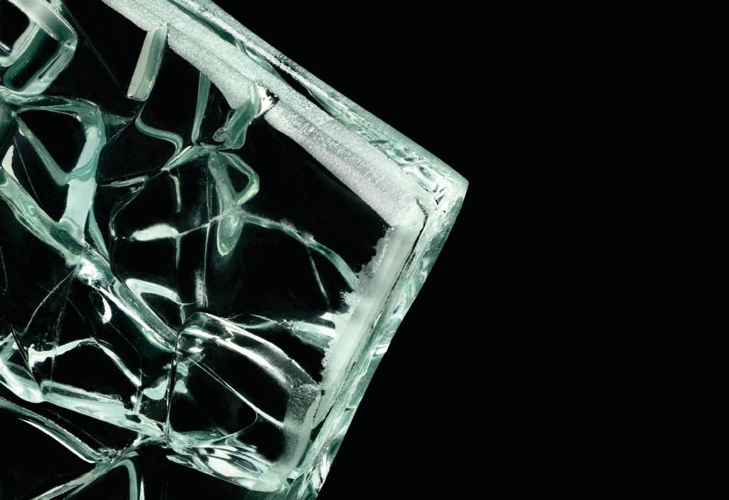 Pulp Studio fuses thousands of glass shards onto a glass sheet to create Fragmento. The 1-1/4″- to 2-3/4″-thick laminated finish piece can have one or two textured glass faces and a reflective silver coating on one or both faces. The glass, which can be tinted, comes in four patterns that use either large glass pieces—Fragmento (shown)—or small glass pieces—Fragmentito. • www.pulpstudio.com