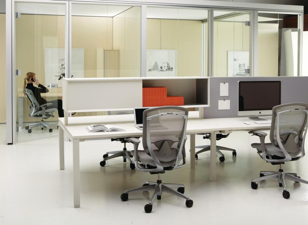 Teknion’s universal desking system Interpret comprises reconfigurable work surfaces, a support structure, and storage components that come in multiple sizes and shapes. Customizable features include screen heights and screen elements, and the integration of components such as whiteboards. Interpret offers several accent-color and finish options, including storm-white laminate for desk surfaces (shown). • teknion.com
