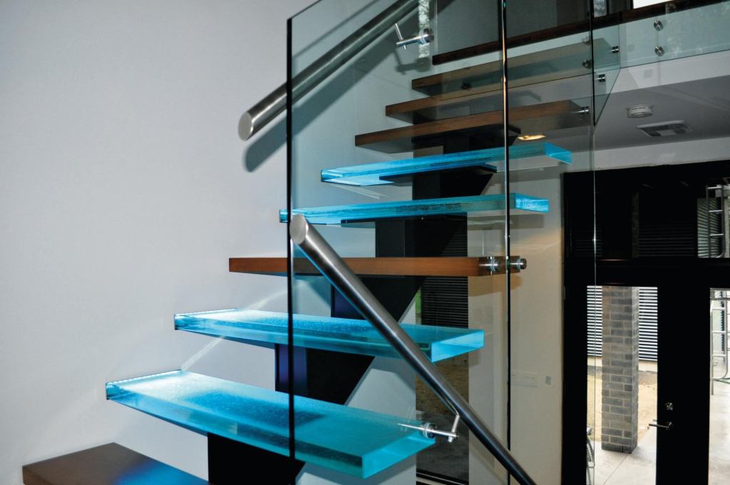 Solid-glass stair treads and risers by ThinkGlass are cast in one solid piece from 100% recyclable glass with thicknesses ranging from 1-1/2″ to 4″. Each step has a textured, slip-resistant surface and the stairs are available in eight textures, two colors—crystal or aqua—and with polished, textured, or brushed edges. ThinkGlass designers can embed the steps with LEDs in eight different colors—including true white, cold white, amber, and red—to create a glowing effect. • thinkglass.com
