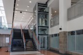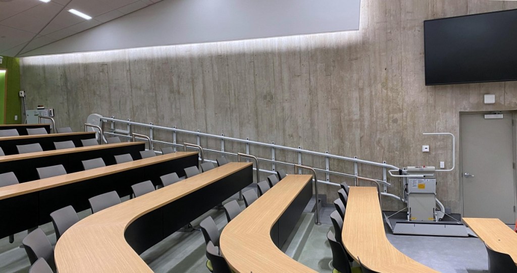 The steps within the lecture halls were quite steep and very long, making the Omega IPL model a great choice, thanks to its ability to travel up to 164 inches on an allowable gradient up to 45 degrees for public building applications.