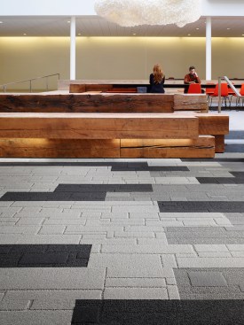 Atlanta-based carpet maker Interface’s quest to turn its petroleum-intensive manufacturing process into one that captures and re-purposes waste didn’t happen overnight—or without help. Since the company publicly shifted course to greening its supply chain more than two decades ago, it’s worked with local design duo David and Cindi Oakey to match the sustainability ethos of its products with design that could sell in a competitive market. The partnership has resulted in collections like Human Nature, which is made of 100-percent recycled-content nylon yarn and offers a surface that brings natural patterns, such as pebbles and grass, indoors. On display at the NeoCon tradeshow this week in Chicago was the Oakeys’ latest collaborations with Interface, Equal Measure and Near and Far. Both are made entirely of nylon yarn sourced from reclaimed fishing nets and draw inspiration from the simplicity of Danish design, the neutral colors of sand and driftwood, and the rugged textures of stone and brick. ARCHITECT caught up with the Oakeys during the event to learn how they channel elements of nature to enliven interiors.