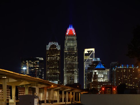 It’s hard to miss the Bank of America Corporate Center among the buildings dotting the skyline of Charlotte, N.C. The tower, Charlotte’s tallest, is among the grandest on the East Coast, rising 871 feet above the city, and its crown adds to the building’s remarkable presence during the day. Built in 1992, Bank of America’s world headquarters building is said to be visible to the naked eye as far as 35 miles away on a clear day.
