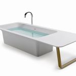 Part of the Origami collection, this bathtub from Stocco is made from a composite material called Cristalplant that is so hygienic that it does not need special cleansing products—just soap and water. Shown in the freestanding versions, the tubs may be personalized using metal panels and various accessories, such as this wood extension.