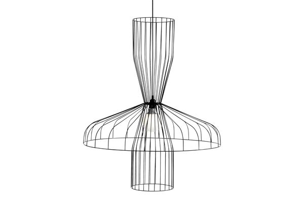 Three steel-wire elements can be mixed and matched to create this modular pendant by designer Nathan Yong. Each of Parachute’s components can be oriented facing upward and downward and combined with up to six pieces for a range of silhouettes. Black or copper lacquered metal is offered, creating an elegant industrial effect.