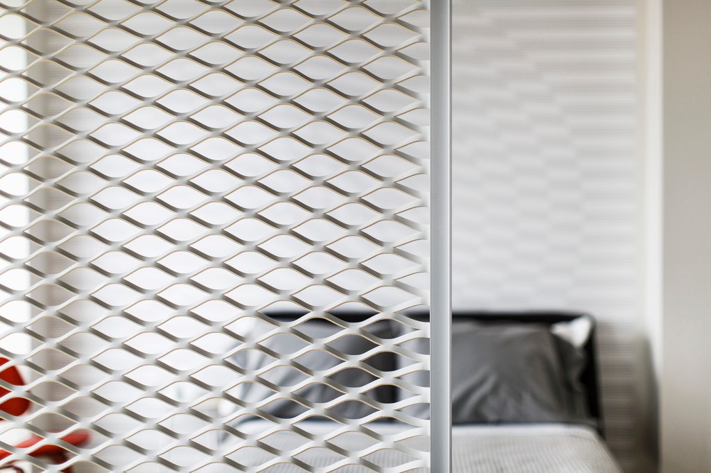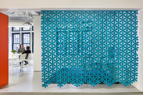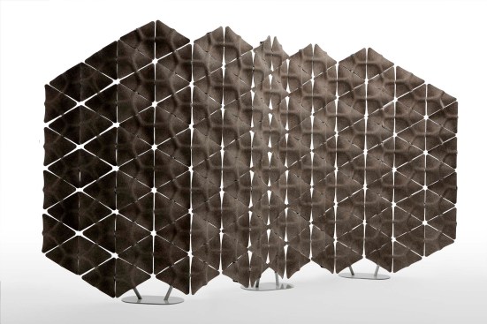 This modular partition system from London studio Layer for textile company Woven Image comprises pressed, recycled hemp tiles and a plastic hexagonal lattice frame mounted on aluminum base plates. The versatile, snap-in-place Scale can be re-assembled as a space’s needs change, creating both solid and open walls, while mitigating sound and adding visual interest with its combination of geometries.