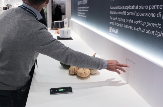 Lapitec is in the process of developing a smart interface for its sintered stone kitchen worktops in partnership with Italian smart home provider Vimar. In the current prototype model, a wireless device charging station and a set of programmable touch controls are directly integrated into the surface of the stone. Vimar’s home automation system allows users to assign specific functions to each control, including spot lighting or small appliance activation.