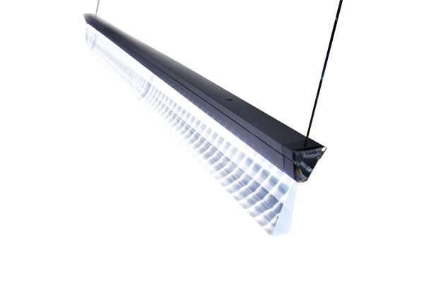 This linear LED pendant is made of clear acrylic and films that, together, are engineered to focus light while remaining translucent even when illuminated. Emitting 800 lumens per linear foot, the bottom of the light guide uses films to distribute light at multiple angles. Sold in 8’ lengths, connectors can be used to create longer runs. Beam-spread options include narrow, medium, and wide distributions. Available in clear anodized, black anodized, and white paint finishes. 3MArchitecturalMarkets.com
