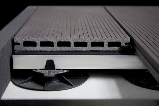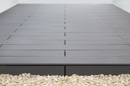 The planks can be assembled over an aluminum substructure that has been installed onto a flat, enclosed surface with a 2% slope to allow for rainwater drainage. The tiles are fire-, frost-, skid-, and ultraviolet-ray resistant.