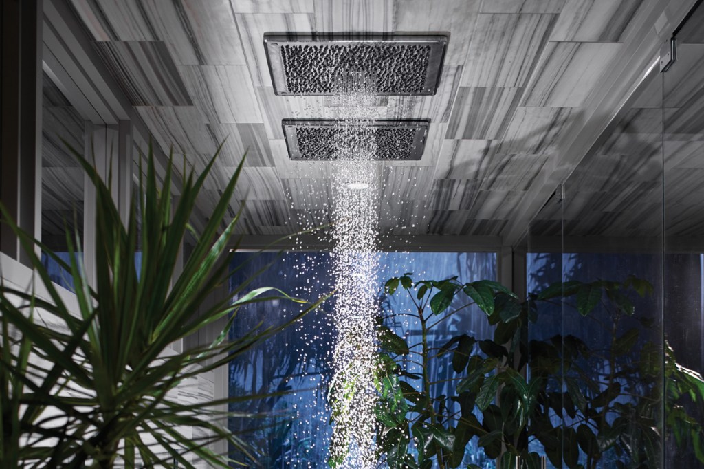 This 19″-square ceiling mounted panel simulates natural rainfall through 775 concave nozzles. Available in seven finishes including polished chrome and vibrant brushed bronze. us.kohler.com