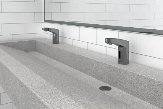 Offered in options of Corian or natural stone, this sloped basin is offered in single-, double-, triple- and quadruple-user stations. Compatible with Sloan’s sensor-activated faucets. sloan.com