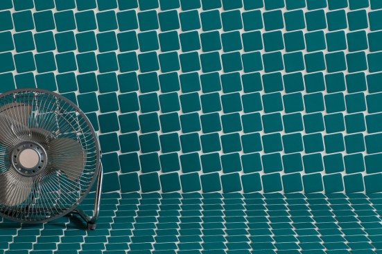 These 0.4″-thick square glass tiles, inspired by Gestalt psychology, create a slanted mosaic intended to warp the viewer’s perception. Offered in three colors: gray, white, and green (shown). mutdesign.com