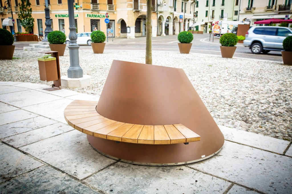 This irregularly shaped steel planter features an affixed bench, which can be made from Iroko or Okoume wood.