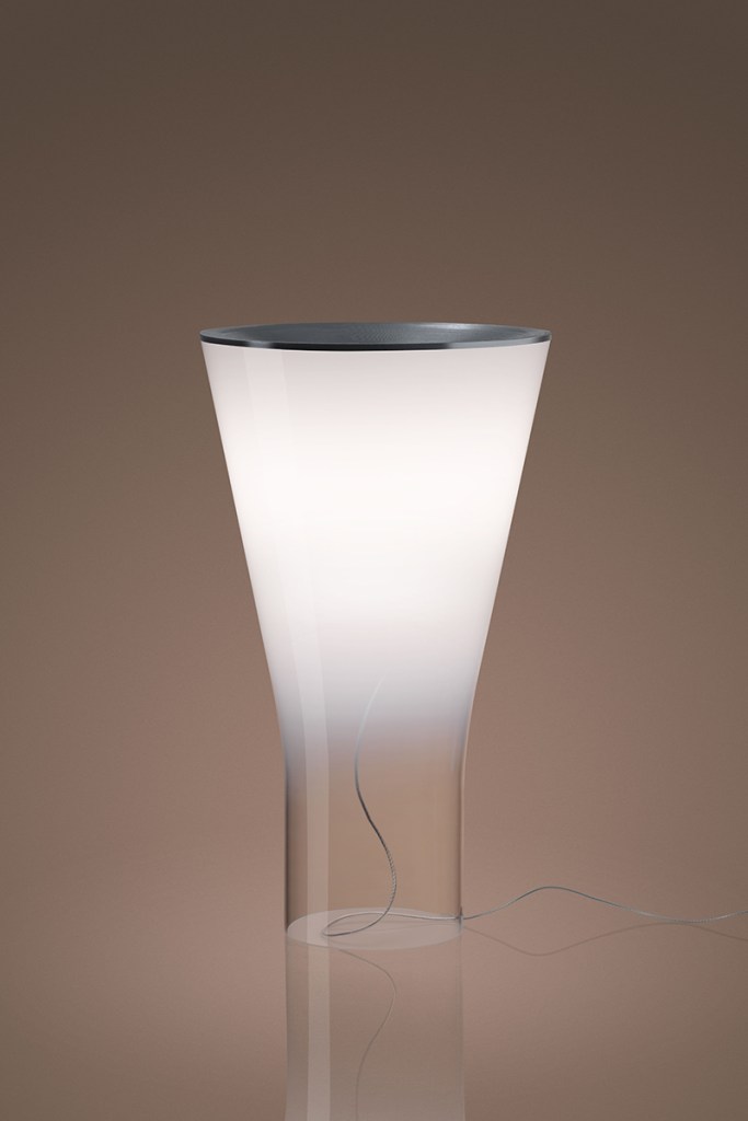 Designed by Milan-based architecture firm Ludovica + Roberto Palomba for Foscarini, this table lamp is made of handblown glass and aluminum. Soffio flares out from its transparent cylindrical vessel base to its top, where a frosted white finish conceals the LED light source. The 13.8W luminaire comes in 2700K with a CRI greater than 80, and can deliver up to 1,300 lumens. foscarini.com