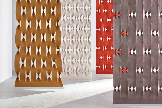 Created in collaboration with Polish felt artist Anna Spakowska, this collection of four division panels provides visual and acoustical buffering for a variety of spaces. Crafted from plush Italian wool felt, the panels feature abstract geometric cutouts inspired by the traditional Polish pastry faworki (“angel wings”). Available in nine hues, each panel measures 47.5″ wide, 118″ tall, and 3.5mm thick. Panels can be suspended or floor-mounted using Carnegie hardware. carnegiefabrics.com