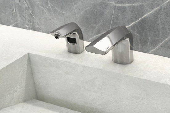 With an angular and prominently positioned design, this sensor-activated faucet and soap combo from Sloan’s Chicago-inspired Clark Street collection brings precise angles into harmony with subtle curves that capture light and attention. The modular one-piece assembly attaches to the deck surface while a motor assembly suspended under the counter connects to the soap-dispenser spout and has a battery life of up to 45,000 activations. Available in a polished chrome finish and ships with two bottles of foam soap. sloan.com