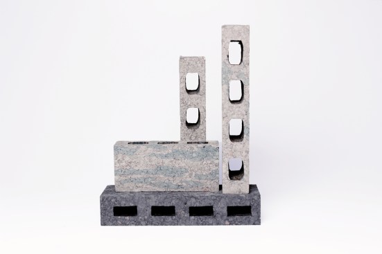 Lee turns discarded newspapers into a pulp, mixes in wood glue, and presses it into molds to form bricks that look like concrete masonry units. Once the shape has set, the bricks are taken out of the mold to dry, and then sanded for uniform and smooth edges. The 2-inch-thick bricks measure 4 inches wide by 11.8 inches long, and have a marble-like surface reminiscent of the Turkish Ebru art form.