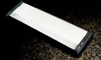 This undercabinet luminaire has a clean, architectural appearance with no visible hardware. Its full-face, recessed glass lens provides a continuous plane, while inside, a full-length specular aluminum reflector produces a uniform distribution of light. Available in 1-, 2-, 3-, or 4-lamp configurations, the fixture is composed of an extruded aluminum housing and die-cast endcaps. It takes both low-voltage halogen and xenon lamps and is offered in four powder-coat finishes—white, black, bronze, and aluminum.