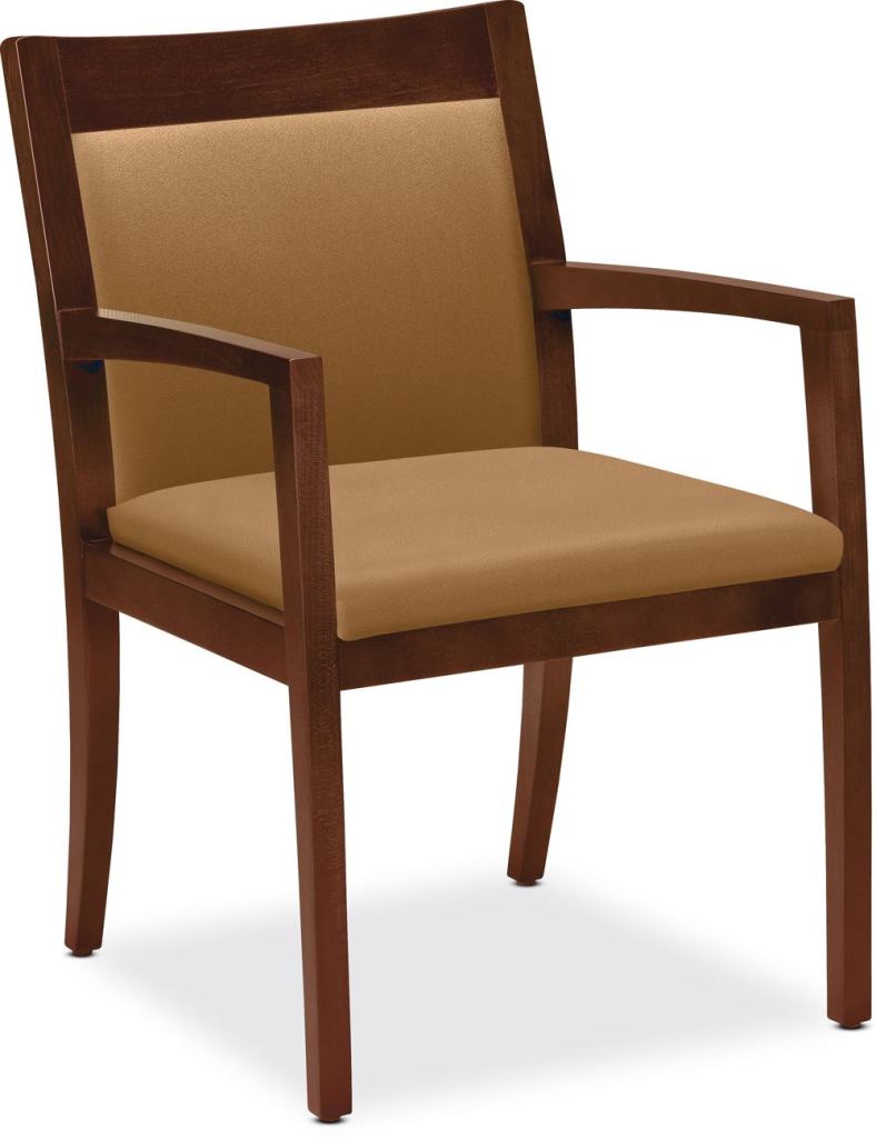 The Laurus chair from The HON Co. features a hardwood frame with a curved profile and cushioned, upholstered seat. It is offered with seven finish stains and myriad fabrics. It is available with an all-wood slat back and upholstered seat or with an upholstered back with an upholstered seat. The line is certified as Indoor Advantage Gold by Scientific Certification Systems. hon.com; 800.553.8230.