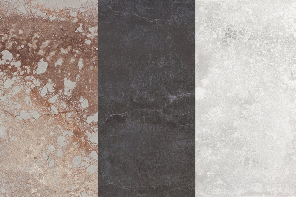 These solid quartz surfaces all represent a modern take on the exposed concrete finishes commonly found in industrial architecture. Caesarstone’s Excava features a blend of light gray tones and warm, auburn hues, recalling the traces of rust and patina on aged concrete. Meanwhile, Dekton’s Laos and Silestone’s Silver Lake evoke the look and texture of weathered concrete surfaces. The three products would complement a range of hardware styles and be tough enough to endure many applications.