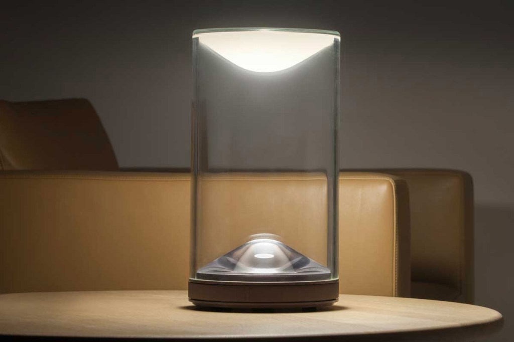 Designed by London-based Foster + Partners, this 18.8W glass fixture emits light from a single LED at its aluminum base upward into a reflective cone. The fixture measures 7” in diameter by 11.8”-tall, and has a grooved base—also a rotating dimmer—that is offered in four finishes including anodized bronze, black, brass, and silver. lumina.it