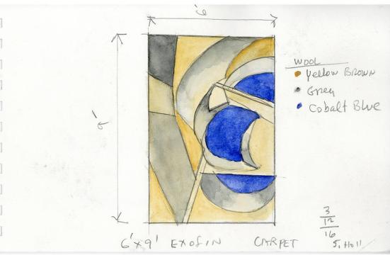 On view through Oct. 28, the exhibition also features materials and studies used in the design process, including watercolors, models, sculptural objects, and various rug samples.