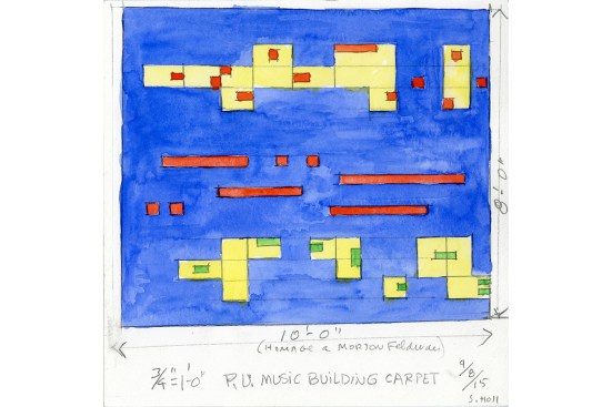 The “Morton Feldman Carpet,” a 7.5-foot by 9.8-foot rug designed in 2015, was inspired by late American composer Morton Feldman’s musical scores. Made of Himalayan wool, the rug has approximately 125,000 knots per square meter (approximately 80.6 knots per square inch), and was originally designed as part of a nine-piece custom carpet collection for Steven Holl Architects’ Lewis Arts Complex at Princeton University in New Jersey. According to a press release, the original carpet sits in a gathering space on the top floor of the university’s Music Building.