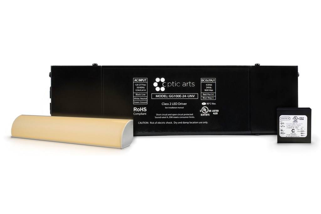 This color dimming system comprises the OpticArts GG100E-24-UNV driver, a zero-to-10V dimming module, and a Flex STP Variable White 1835 light strip. According to the manufacturer, Vintage Dim is the first fully programmable dim-to-warm flexible linear strip product on the market. Modules are shipped standard with an 1800K to 2700K color temperature curve, reminiscent of an incandescent lamp’s color range. Custom dimming curves can be programmed at the factory prior to shipping. opticarts.com