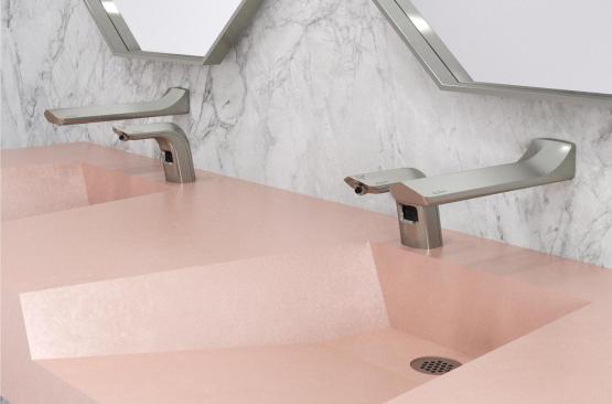 20. Inspired by prisms, the geometric Clark Street faucet and soap dispenser (available in battery-operated or hardwired options) from Sloan are faceted to refract light. The touch-free collection stands out due to its bent planes and chamfered edges. sloan.com