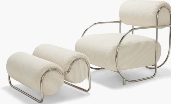 4. Infused with Bauhaus inspiration, the Chromeo chair and ottoman are Australian designer Sarah Ellison’s first forays into working with metal. Curved chromed tubing is paired with bolster cushions, and the pieces are available in ivory corduroy or piccolo velvet. dwr.com