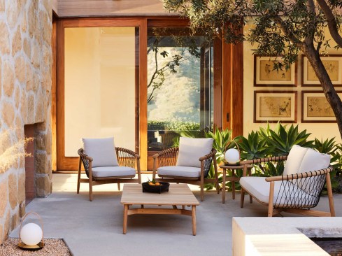 6. Designed by the Austrian firm EOOS, Crosshatch is the first outdoor seating collection for Geiger. Featured on the fourth floor terrace at Fulton Market, the chair and settee comprise a curving teak frame wrapped in a lattice of parachute cords. The outdoor lounge and settee can be paired with a coffee or side table and are available in a variety of upholstery options. geigerfurniture.com