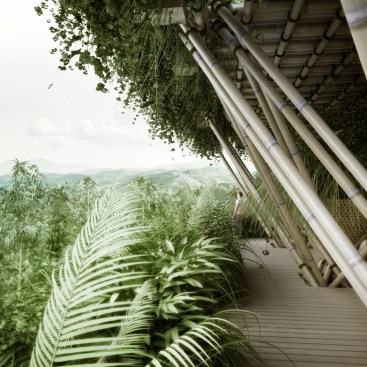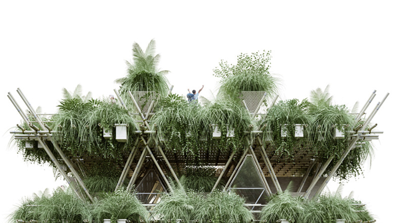 Beijing and Vienna-based Penda has designed a new modular structure with X-shaped bamboo joints. Each one is secured with rope instead of nails or screws, meaning the building can be easily dismantled and the bamboo reused.