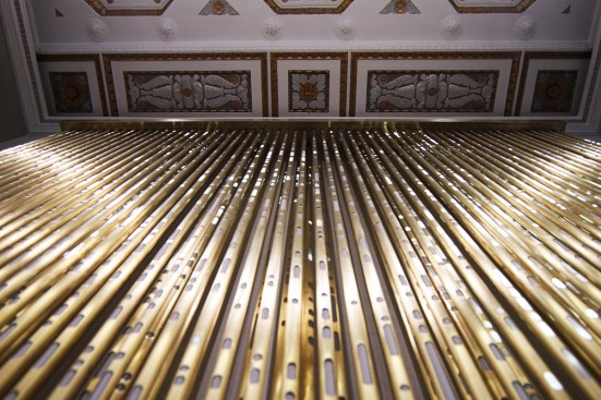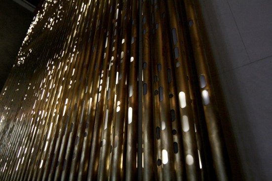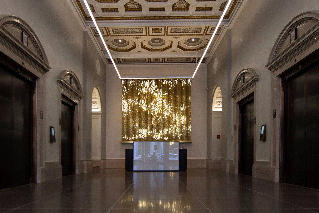 New York–based design studio Softlab has recently completed a permanent lighting installation for the renovated lobby of 315 Montgomery, an historic 16-story office tower in San Francisco’s Financial District. Titled Stratus, the installation is comprised of two layers of staggered brass tubes, each of which is lined with translucent polyester resin and punctuated with laser-cut holes. Measuring 126″ tall by 120″ wide by 8″ deep, the installation incorporates 60 custom LEDs with frosted acrylic diffusers, set into an aluminum channel. The work is custom-programmed with a “generative noise pattern” that according to Softlab, “simulates air flow” and resembles clouds. TouchDesigner—a node-based visual programming language developed by Toronto-based Derivative—sends the pattern to the LEDs, which are controlled by two control boards.