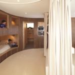 The guest bedroom that Hutker envisioned for this Martha’s Vineyard vacation house is inspired by the boats docked just outside the window. Pale cream board- and-batten encloses floor-to-ceiling bunks with unlacquered brass portals for peeking out. Subtle details such as high-gloss paint, industrial light fixtures, and a rug that mimics ship’s decking complete the nautical touches. Murphy beds flank the bunks to allow for myriad sleeping configurations. Hutker gives clients a finishing touch for each notoriously hard-to-make bunk bed. “My wife, Carla, invented what we call the taco,” he chuckles. “It’s a flat king-size sheet that’s sewn along the fold so homeowners can leave the fitted sheet on between guests and just wash the taco.”