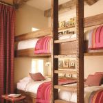 Reclaimed barn wood milled into sturdy planks and beams supports these four bunks. Plaster walls and heavy wool curtains enhance the rustic look. Thick walls allow for deep window sills and recessed book ledges so each occupant has space for refreshments and reading material. Richly hued blankets and rugs are the only clue that this is the girls’ half of twin bunk rooms in a mountain retreat near Lake Tahoe, Calif. Large drawers beneath the beds and built-in dressers means everything can be put in its place. Interior designer Sally Ward created the rugged look, but imbued it with her usual restraint so the space remains uncluttered and airy.