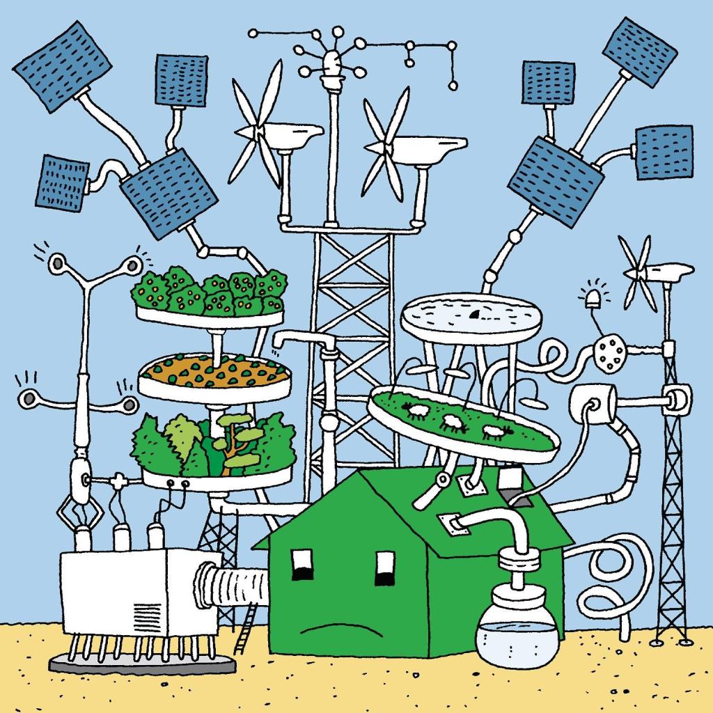 A memorable example is the “Eco-House for the Future” concept that Diller Scofidio + Renfro developed for The New York Times Magazine in 2007. Located on an imaginary two-acre lot somewhere in the American Southwest, this “guilt-free, sustainable luxury house that thrives on excess” draws on existing technologies and “those that may come to be.” As with the concept published in Harper’s, the architecture itself is simplistic—a glass box propped on sculptural legs, like the love child of Mies van der Rohe and Marcel Breuer. With huge expanses of glass in a desert climate, the house is an expensive toaster oven.